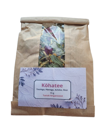 Köhatee on õrn, kuid tõhus taimede kooslus, mis pakub leevendust kurguärrituse ja kuivema köha korral. Paiseleht pehmendab ja rahustab hingamisteid, teeleht toetab lima eraldumist, raudrohi tasakaalustab ning kibuvitsaõied lisavad pehmet marjast nooti ja looduslikku vitamiinituge. See on soe turgutav tassitäis kuuma jooki, mis aitab kehal taastuda ja hingamisel veidi kergemaks muutuda.